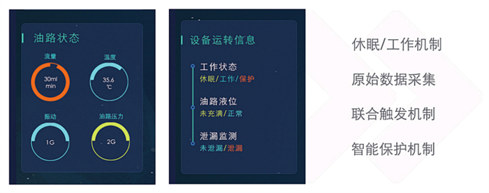 結合設備自我保護設定機制,做到遇到主機設備停機檢修(監測系統內部循環系統仍在工作)無油的狀態,或是內部因為使用時長導致密封效果不佳導致漏油的現象,為避免內部元器件的干燒,系統會切斷油路,進行自我保護。